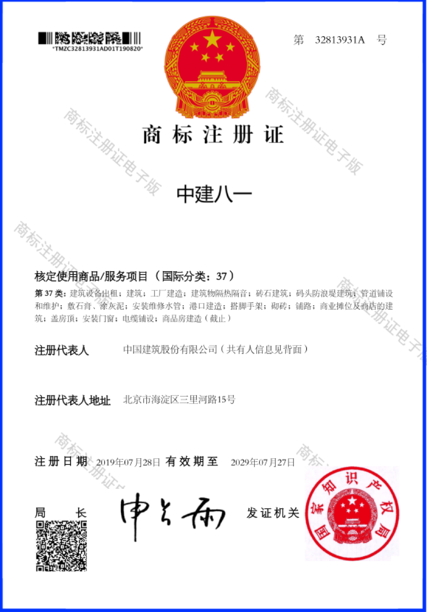 近日,由中建八局一公司申請的“中建八一”商標(biāo)順利通過國家知識產(chǎn)權(quán)局的評審認(rèn)定,獲得商標(biāo)注冊證書,成為中建建筑品牌體系下的子商標(biāo)品牌。