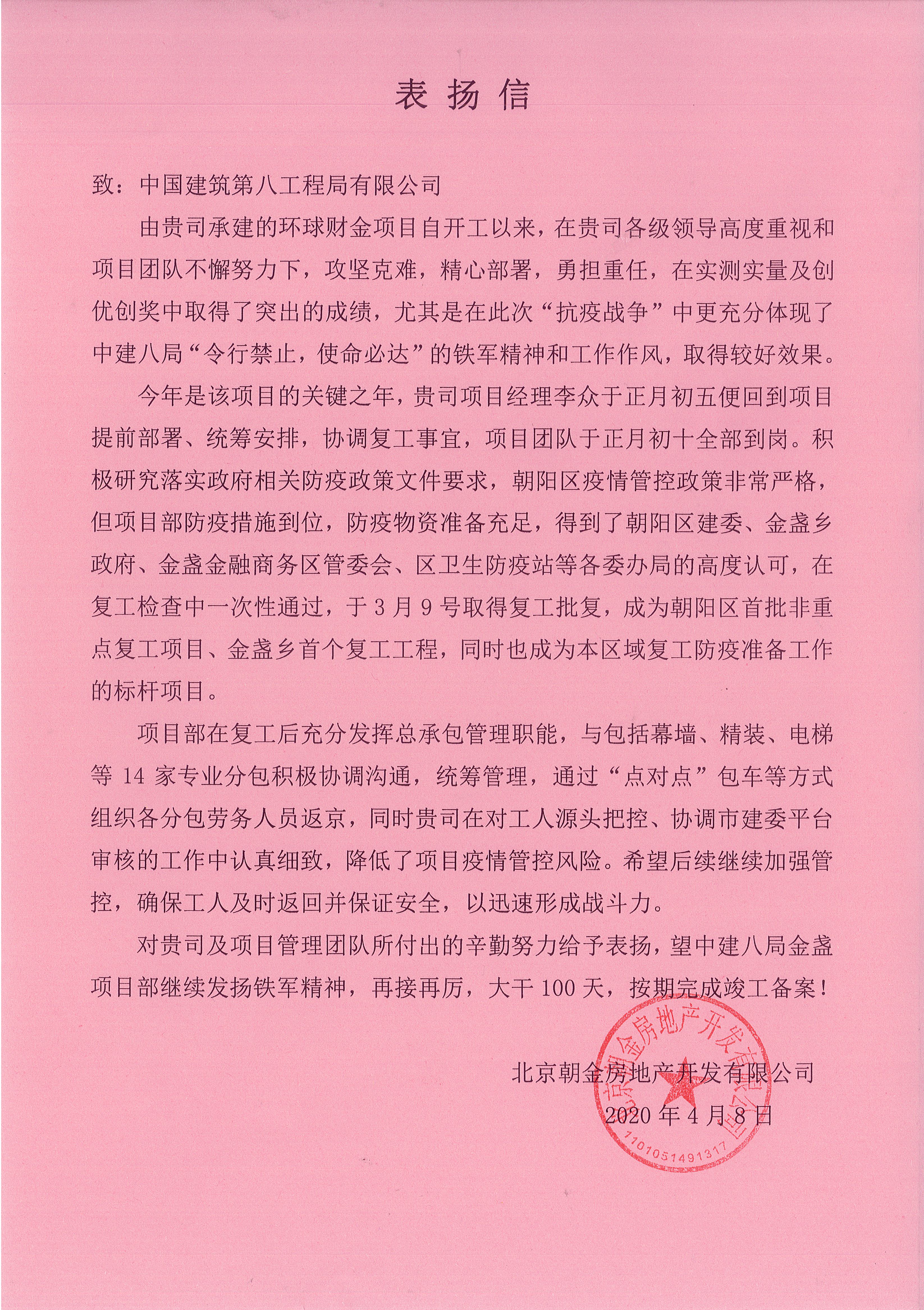 表揚信中提到,在此次抗擊疫情中,金盞項目防疫物資準備充足,疫情管控措施到位,得到了朝陽區(qū)建委、金盞鄉(xiāng)政府、金盞金融商務區(qū)管委會和區(qū)衛(wèi)生防疫站等各級單位的高度認可,在復工檢查中一次性通過,成為朝陽區(qū)首批非重點復工項目、金盞鄉(xiāng)首個復工項目,同時也成為本區(qū)域復工防疫準備工作的標桿項目,同時能夠在復工后充分發(fā)揮總承包管理職能,積極協(xié)調(diào)各參建單位。