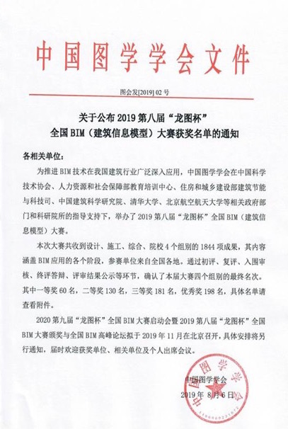 近日,公司在2019第八屆“龍圖杯”全國BIM大賽中,通過精心策劃,合理組織,憑借BIM技術的深度應用與研發創新,最終獲得3項一等獎、2項二等獎、3項三等獎,共計8項獎項的好成績。