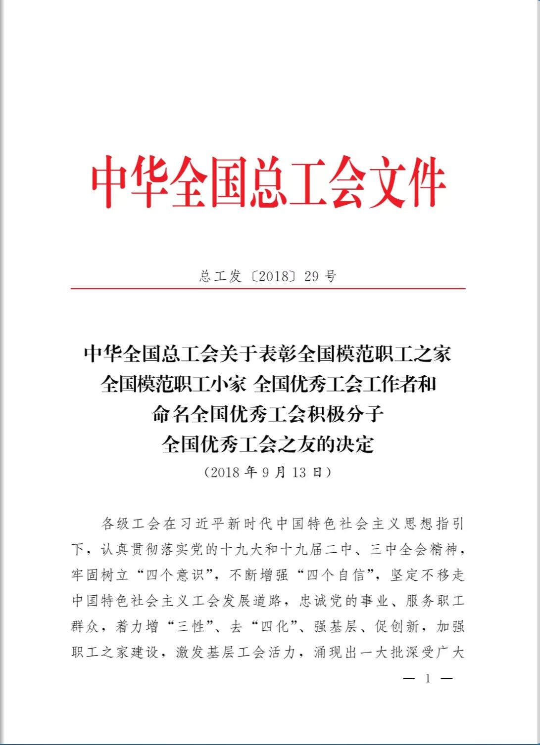 公司工會斬獲“全國模范職工之家”等三項全國榮譽