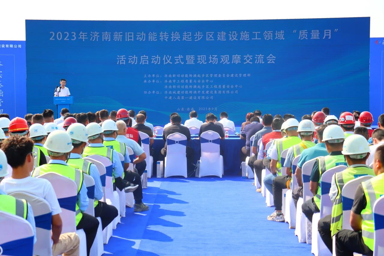 9月8日,2023年濟南新舊動能轉換起步區建設施工領域“質量月”活動啟動儀式暨現場觀摩交流會在中建八局一公司承建的黃河體育中心專業足球場項目舉行。