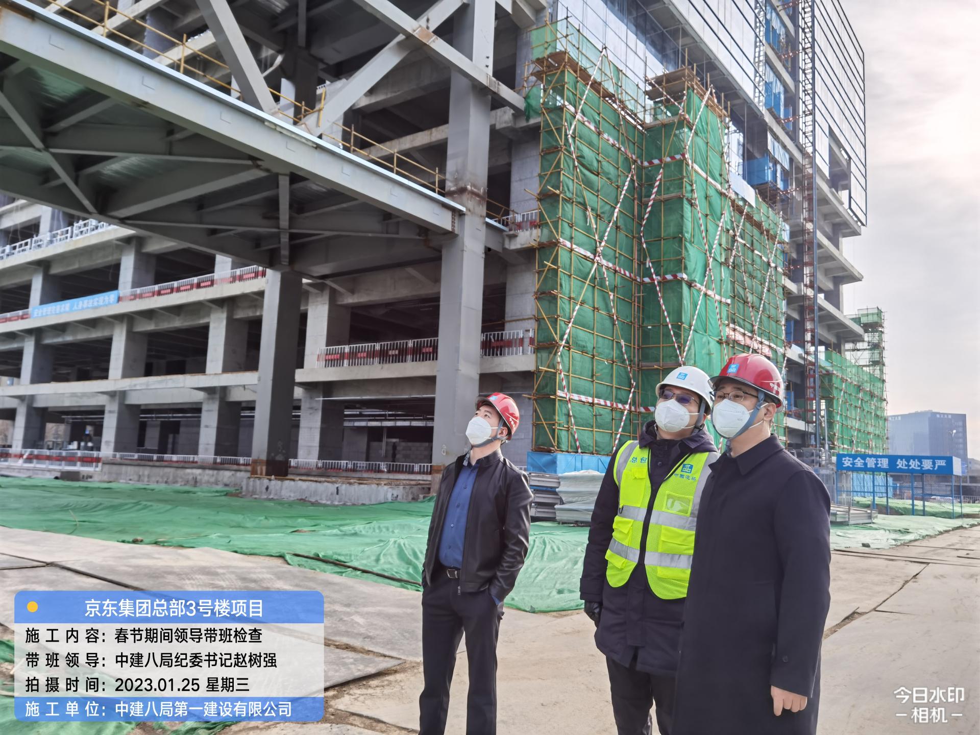 1月25日,中建八局紀委書記趙樹強到京東集團總部3號樓項目帶班檢查,看望慰問春節期間堅守一線的管理人員,中建八局一公司華北公司軍民融合事業部副總經理張世龍、項目經理程增龍及主要管理人員陪同。