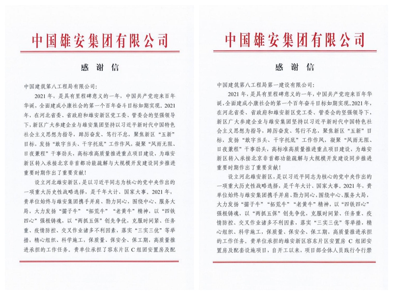 服務千年大計,筑夢未來之城。 近日,容東片區C組團安置房及配套設施項目收到中國雄安集團感謝信,高度贊揚公司在助力新區回遷群眾喜圓“新居”夢過程中展現出的非凡勇氣和堅韌精神。