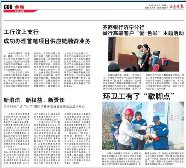 “……‘我們建筑工和清潔工是一個階層,他們的辛苦我們也感同身受。’項(xiàng)目部安全總監(jiān)黃繼明如此表示設(shè)立的目的。”這篇題為《環(huán)衛(wèi)工有了歇腳點(diǎn)》的報道刊登在了《齊魯晚報》3月17日C08版,對一公司濟(jì)寧人醫(yī)院項(xiàng)目部設(shè)立“環(huán)衛(wèi)工歇腳點(diǎn)”的做法進(jìn)行了報道。