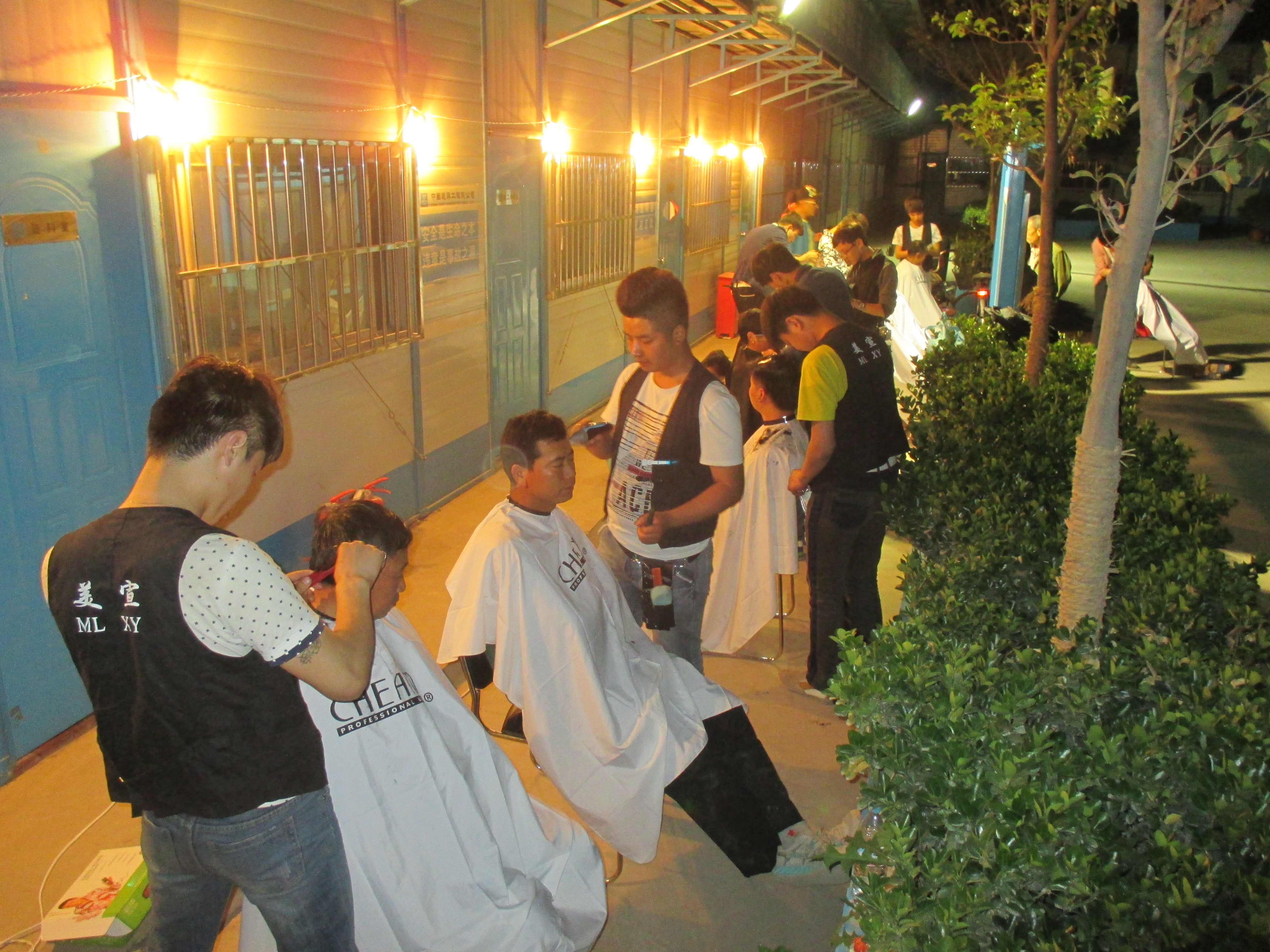 5月15日下午,東城逸家項目部從濟南“美宣美發”請來了13名理發師,為工地上的外來務工人員理發。從下午5點半到晚上10點,先后有110名農民工兄弟姐妹接受了這項特殊的服務,他們當中有20出頭的年輕小伙兒,也有年過半百的大叔大嬸兒。為了保證理發的效果,項目部還專門拉起電線,裝上燈泡,為理發師們照明。