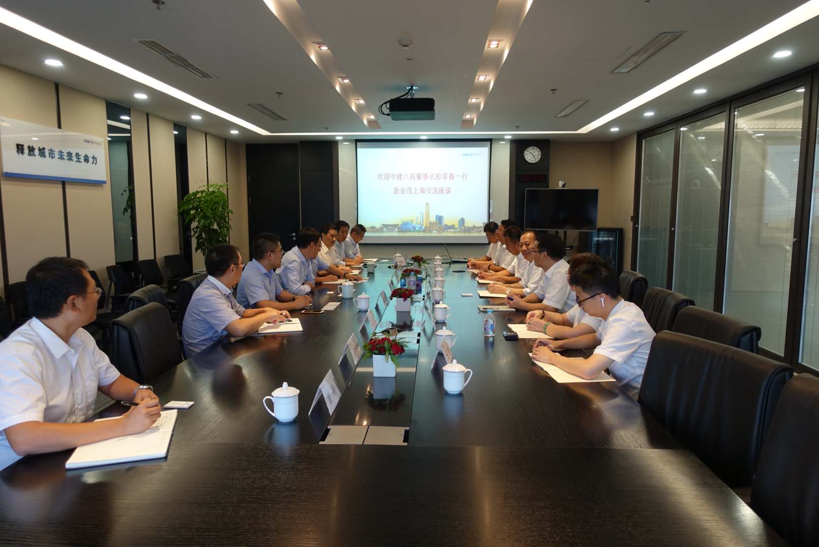 8月22日,中建八局黨委書記、董事長校榮春,一公司董事長董文祥,局上海公司董事長王文元,局市場部經理姚勤波,一公司華東公司書記王為等一行受邀拜訪了中國金茂高級副總裁兼華東大區董事長陶天海,副總經理杭雙生,副總經理王振松,副總經理林如濤等領導及各部門負責人。