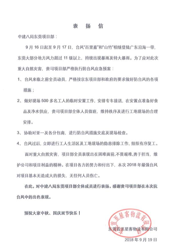 近期,東莞京東項目接到來自業(yè)主東莞首至星客物流有限公司的表揚信,對項目部全體成員應(yīng)對超強臺風(fēng)“山竹”的出色表現(xiàn)進(jìn)行表揚及感謝。應(yīng)對此次超強臺風(fēng),項目部嚴(yán)格執(zhí)行防臺風(fēng)應(yīng)急預(yù)案,按京東項目部和政府的要求做好防臺風(fēng)的各項措施,妥善安排500多名工人的臨時安置,并在臺風(fēng)過后立即進(jìn)行生活區(qū)及現(xiàn)場的隱患排除工作,組織有序復(fù)工。經(jīng)項目全員的努力付出,此次2018最強臺風(fēng)對項目基本未造成大的損失,無任何人員傷亡。京東項目部全體員工也將繼續(xù)發(fā)揚不畏困難,勇于擔(dān)當(dāng)?shù)木?,維護公司和項目利益。(王曦)