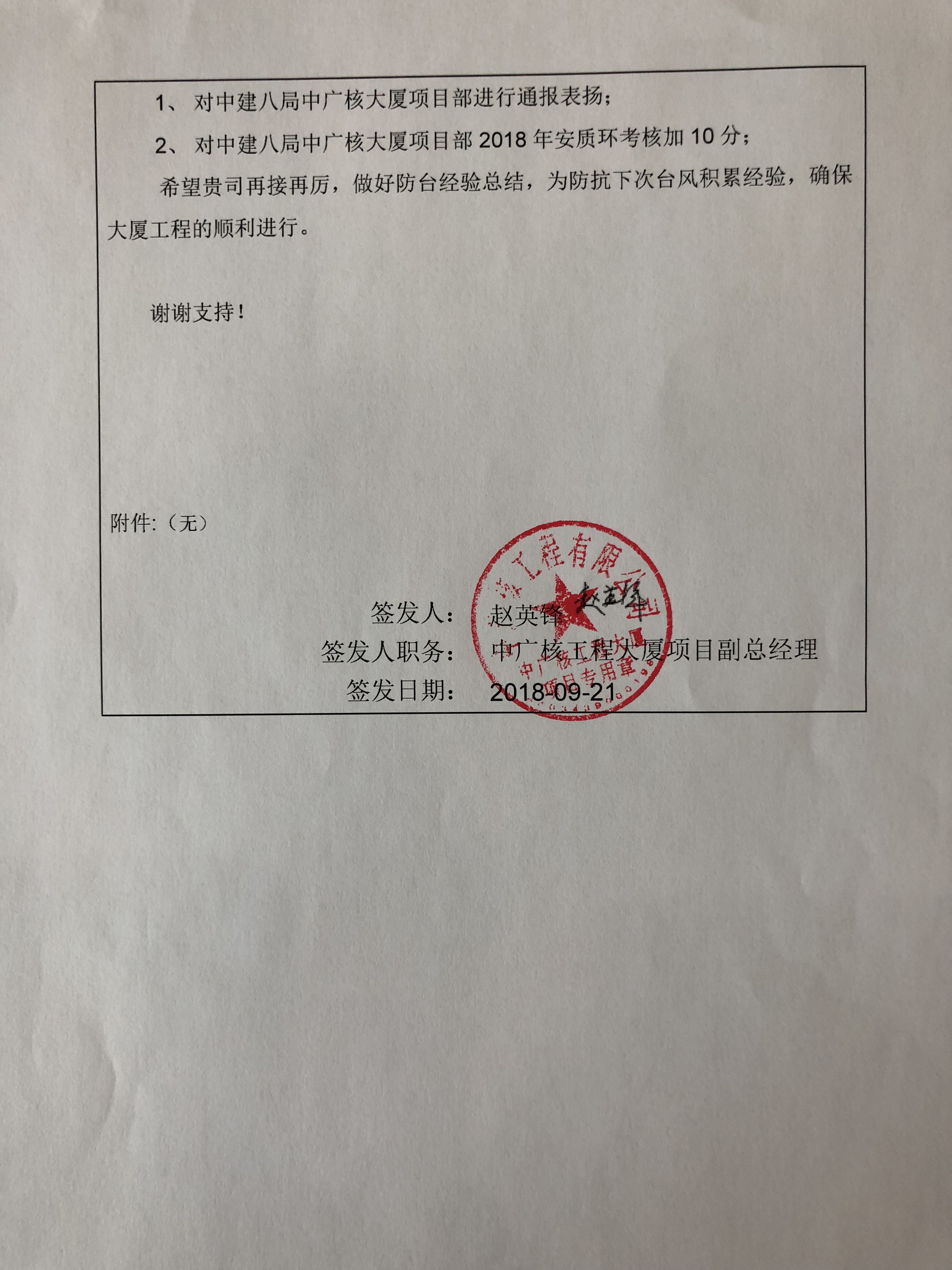近日,中建八局華南分局收到來自業主中廣核工程有限公司的表揚信,對公司中廣核工程大廈項目在開工后現場實施狀態以及項目部全體成員應對超強臺風“山竹”的出色表現進行表揚及感謝。