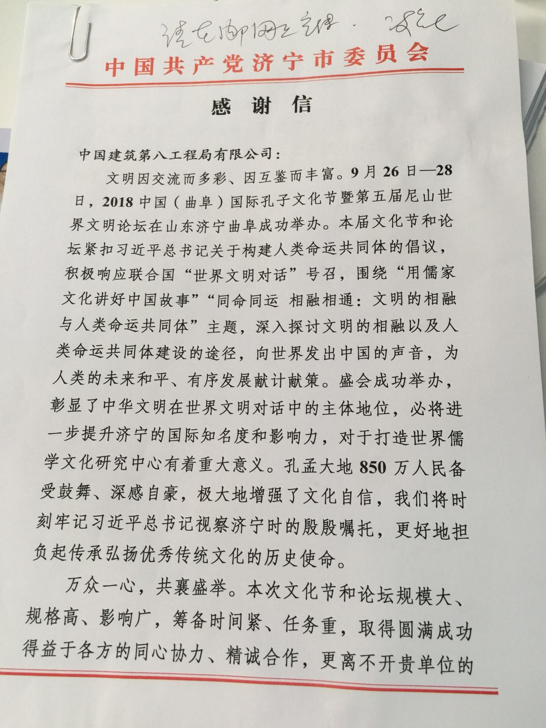 近日,中共濟寧市委、濟寧市人民政府向中建八局發來表揚信。對由中建八局一公司承建的曲阜尼山圣境項目為2018中國(曲阜)國際孔子文化節暨第五屆尼山世界文明論壇成功舉辦做出的貢獻表示衷心的感謝。