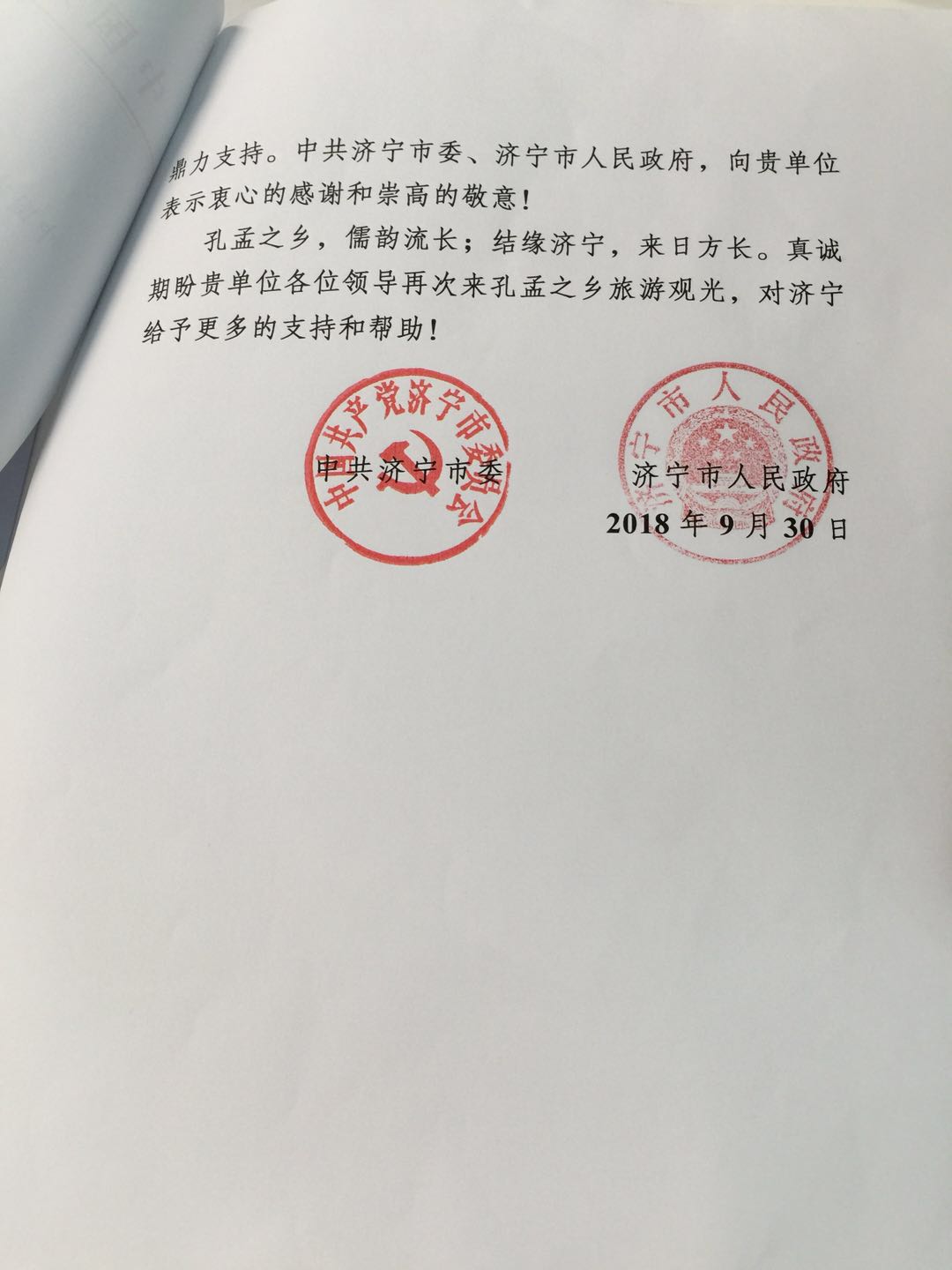 感謝信中表示“萬眾一心,共襄盛舉。本次文化節和論壇規模大、規格高、影響廣,籌備時間緊、任務重,取得圓滿成功得益于各方的同心協力、精誠合作,更離不開貴單位的鼎力支持。中共濟寧市、濟寧市政府,向貴單位表示衷心的感謝和崇高的敬意!”