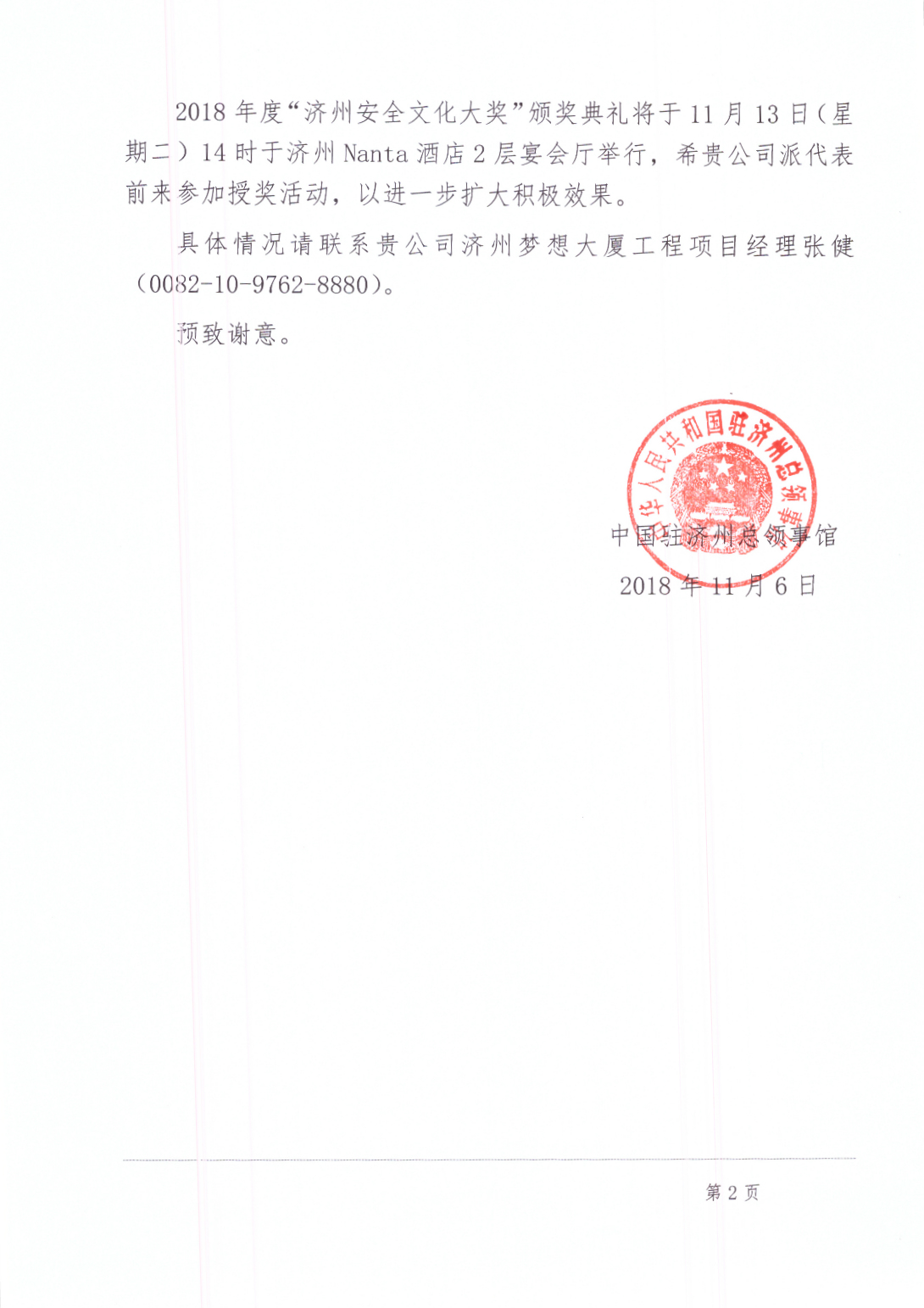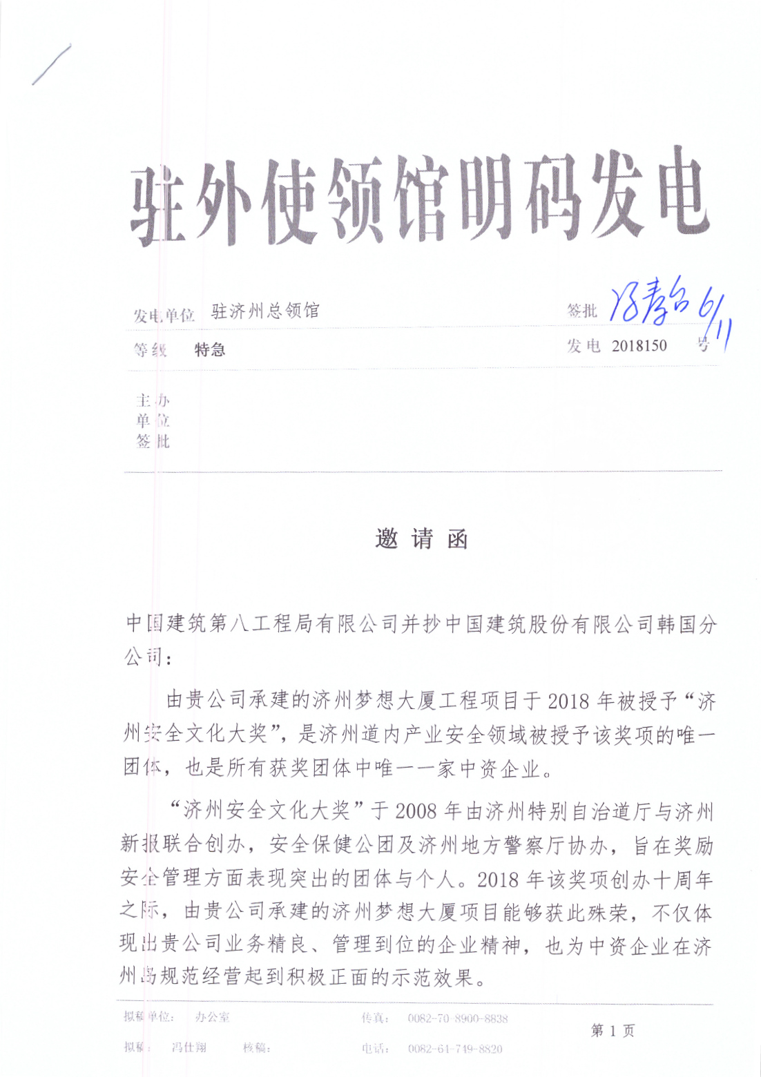 116日,駐外使領館明碼發電,濟州總領事馮春臺親自簽批邀請函,公司將作為濟州道內產業安全領域被授予該獎項的唯一團體,也是唯一的中資獲獎企業,受邀參加13日在濟州Nanta酒店舉行的頒獎典禮。