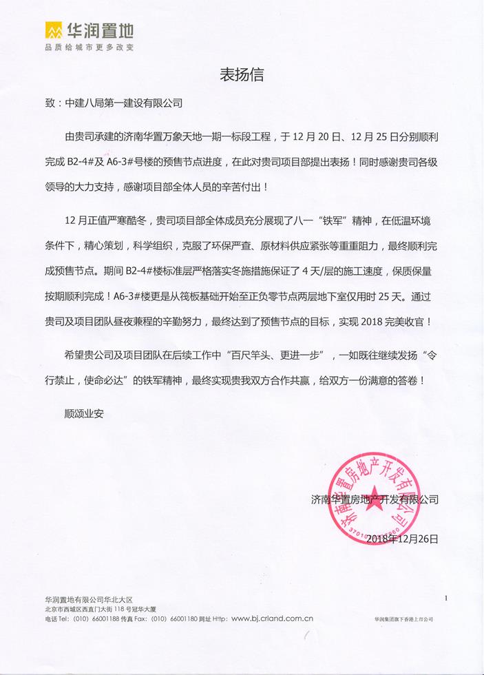 近日,濟南華置萬象天地項目一期一標段總承包工程收到濟南華置房地產開發有限公司發來的表揚信,信中對一公司、濟南公司各級領導的大力支持及項目部管理人員在搶工期間攻堅克難和不畏勞苦的精神提出了表揚,并對項目管理團隊給予了充分肯定。