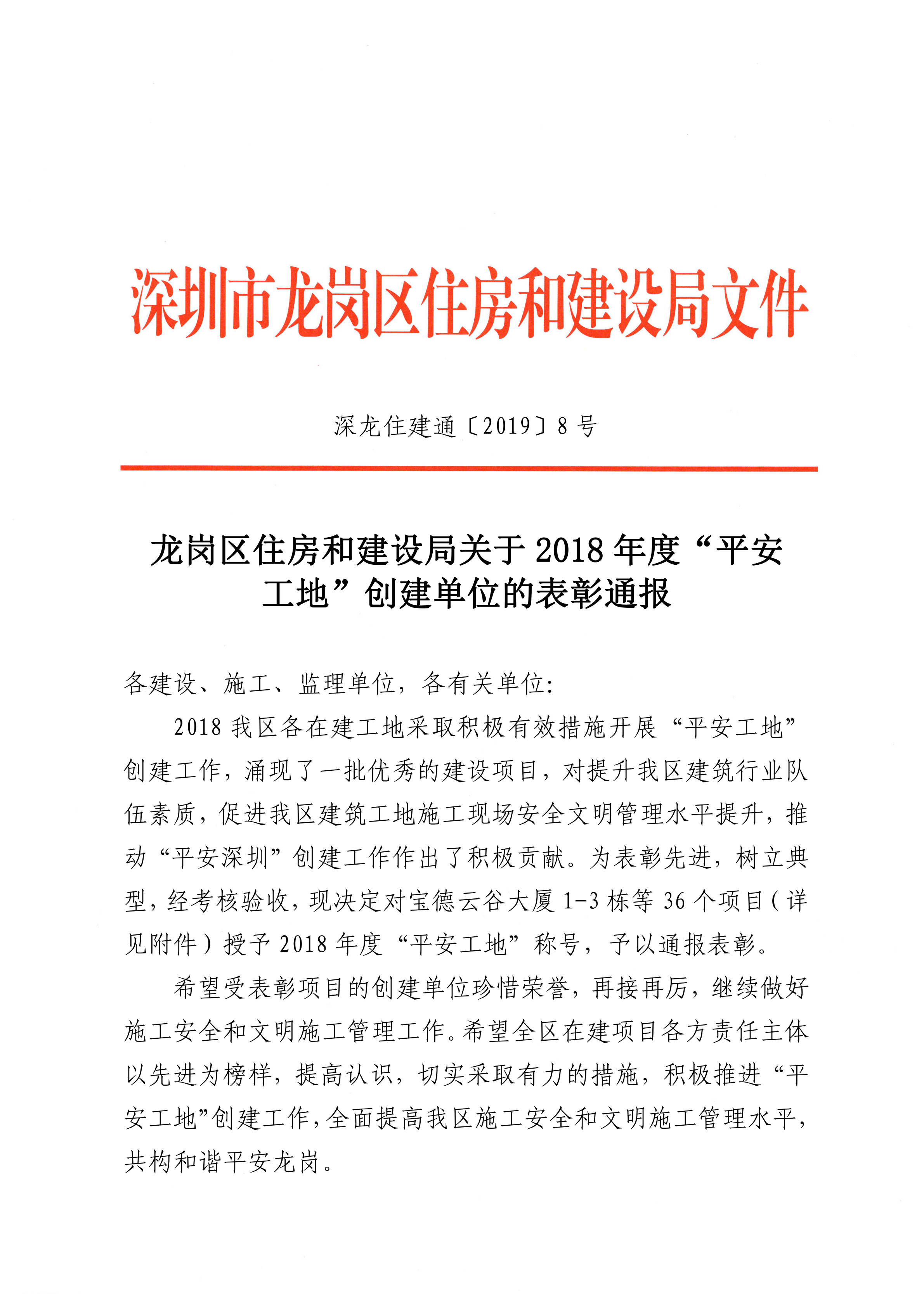 《龍崗區住房和建設局關于 2018 年度“平安工地”創建單位的表彰通報》