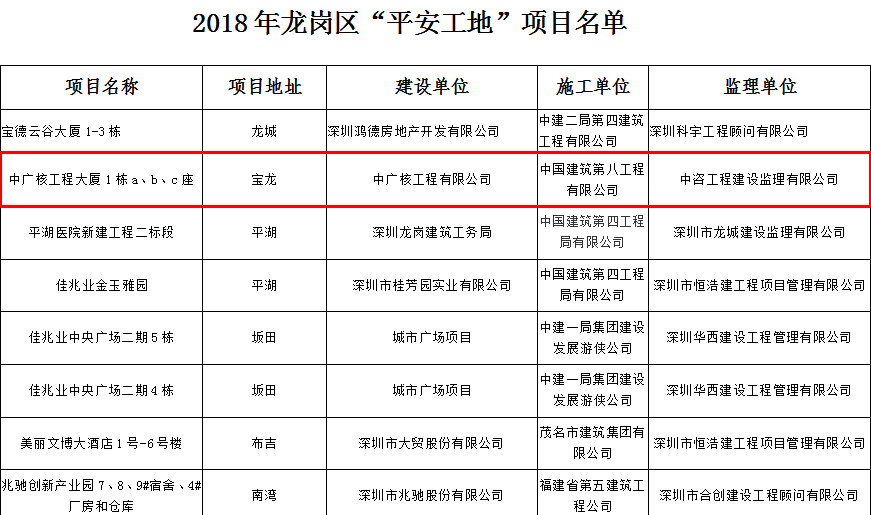 近日,深圳市龍崗區住房和建設局對在促進龍崗區建筑工地施工現場安全文明管理水平提升,推動“平安深圳”創建工作作出了積極貢獻的項目授予 2018 年度“平安工地”稱號,并予以通報表彰。中廣核工程大廈項目榮獲“平安工地”稱號。