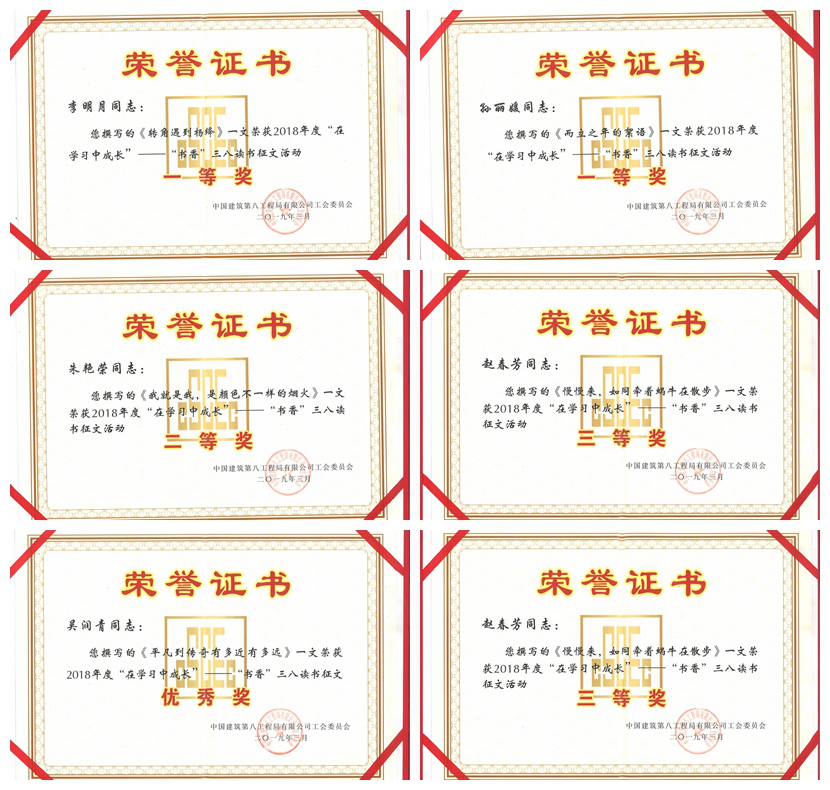本次活動(dòng)公司共報(bào)送讀書征文類作品8篇,家書類作品4篇。在全局150個(gè)作品評(píng)選中,公司參賽作品獲得一等獎(jiǎng)2個(gè),二等獎(jiǎng)1個(gè),三等獎(jiǎng)1個(gè),優(yōu)秀獎(jiǎng)1個(gè)。公司女工委獲得局2018年度“書香三八”讀書征文活動(dòng)組織獎(jiǎng)。