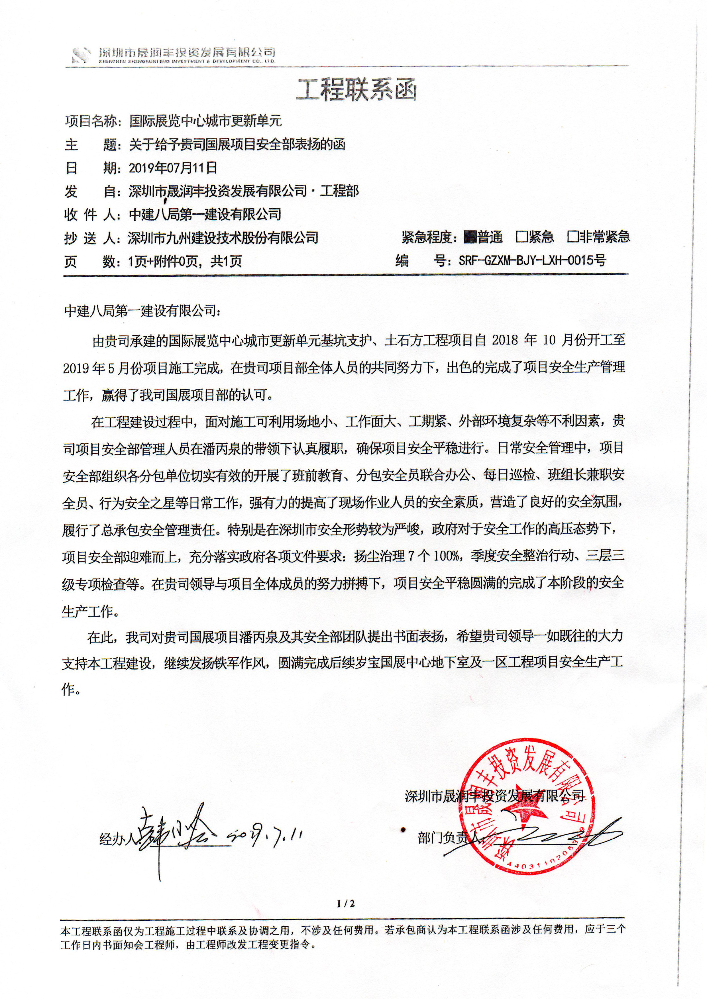 7月11日,國際展覽中心城市更新單元基坑支護、土石方工程項目榮獲業(yè)主深圳市晟潤豐投資發(fā)展有限公司表揚信。本項目自2018年10月份開工至2019年5月份施工完成,在項目部全體人員的共同努力下,出色的完成了項目安全生產管理工作,業(yè)主對項目經理王正超和安全總監(jiān)潘丙泉及其安全部團隊提出書面表揚。