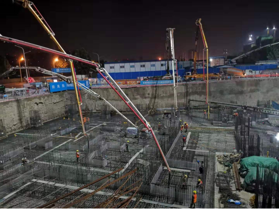 華置萬象天地項目北側緊鄰工業南路,南側為在施工程,西側緊鄰華潤置地售樓處,只有東側一條臨時道路通往基坑里。為保證澆筑速度與澆筑質量,項目在傳統的泵送澆筑方式的基礎上,再增加一臺伸縮式皮帶輸送機輔助澆筑,共計投入五臺汽車泵+一臺伸縮式皮帶輸送機組織澆筑。六泵齊發,全速開進,將狹小場地的利用率真正實現了最大化,用時24小時圓滿完成7000m3混凝土的澆筑任務,實現了每小時約300m3的澆筑速度目標。