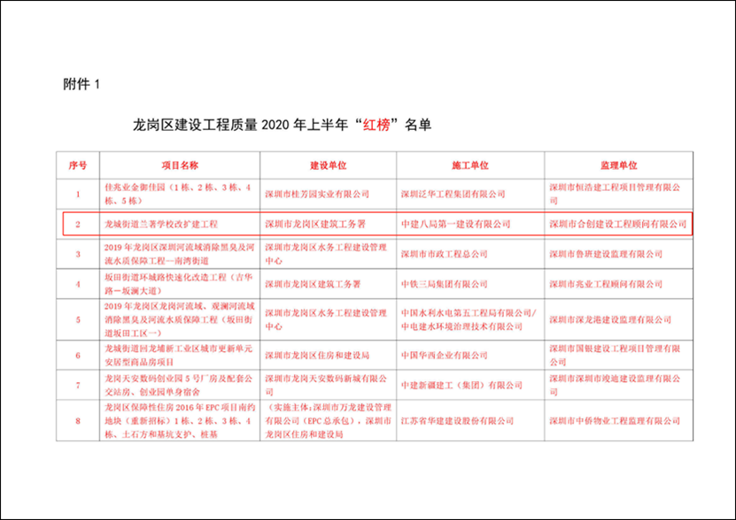 蘭著學校登上龍崗區建設工程質量2020上半年“紅榜”