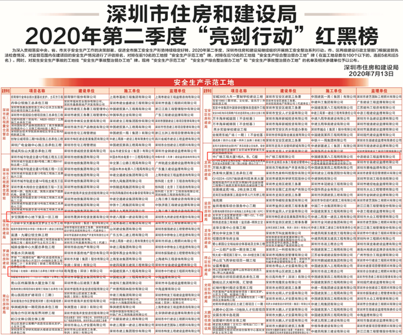 近日,深圳市住房和建設局公布了深圳市2020年度“亮劍行動”紅黑榜,歲寶國展中心項目、悅彩城(北地塊)項目、中廣核工程大廈項目登上紅榜,榮獲“安全生產示范工地”稱號。蘭著學校項目成功登上深圳市龍崗區建設工程質量2020年上半年“紅榜”,得到龍崗區住建局通報表揚。