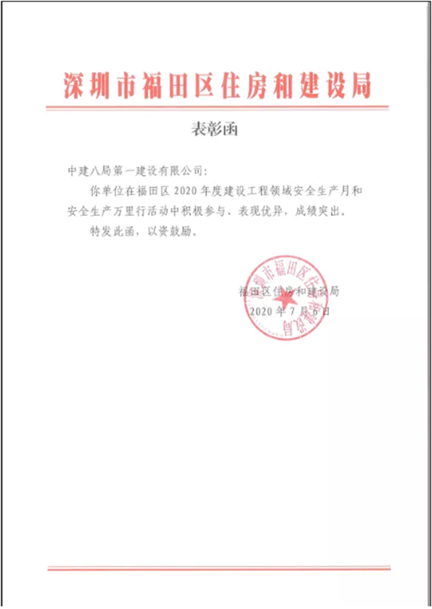 憑借優異表現,歲寶國展中心項目喜獲福田區住房和建設局表彰函,對項目在福田區2020年度建設工程領域安全生產月和安全萬里行活動中的優異表現給與肯定。