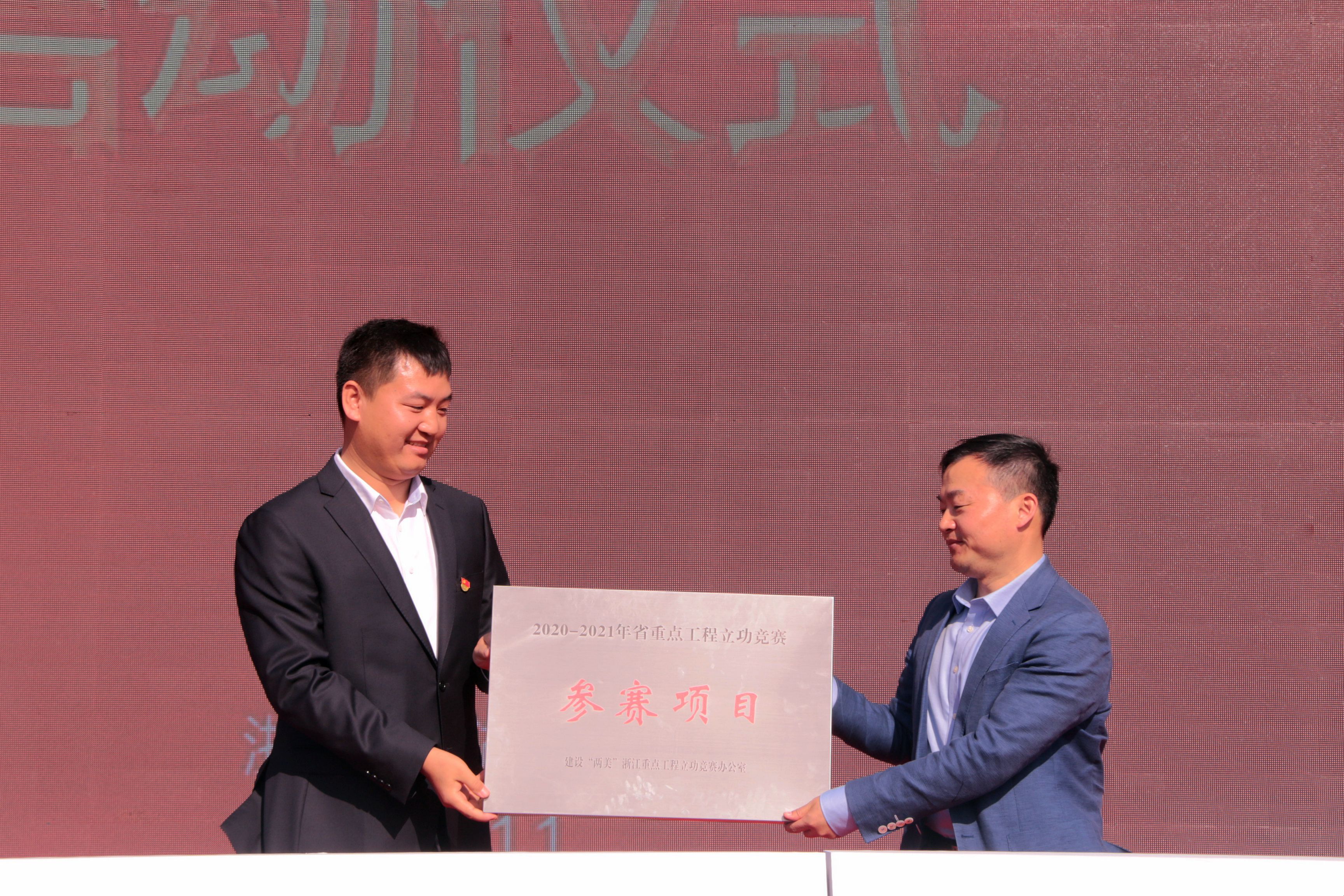 湖州市總工會(huì)副主席楊少章向中國(guó)制造2025產(chǎn)業(yè)園建設(shè)項(xiàng)目(二期工程)EPC總承包項(xiàng)目授予“2020-2021年省重點(diǎn)工程立功競(jìng)賽參賽項(xiàng)目”獎(jiǎng)牌。
