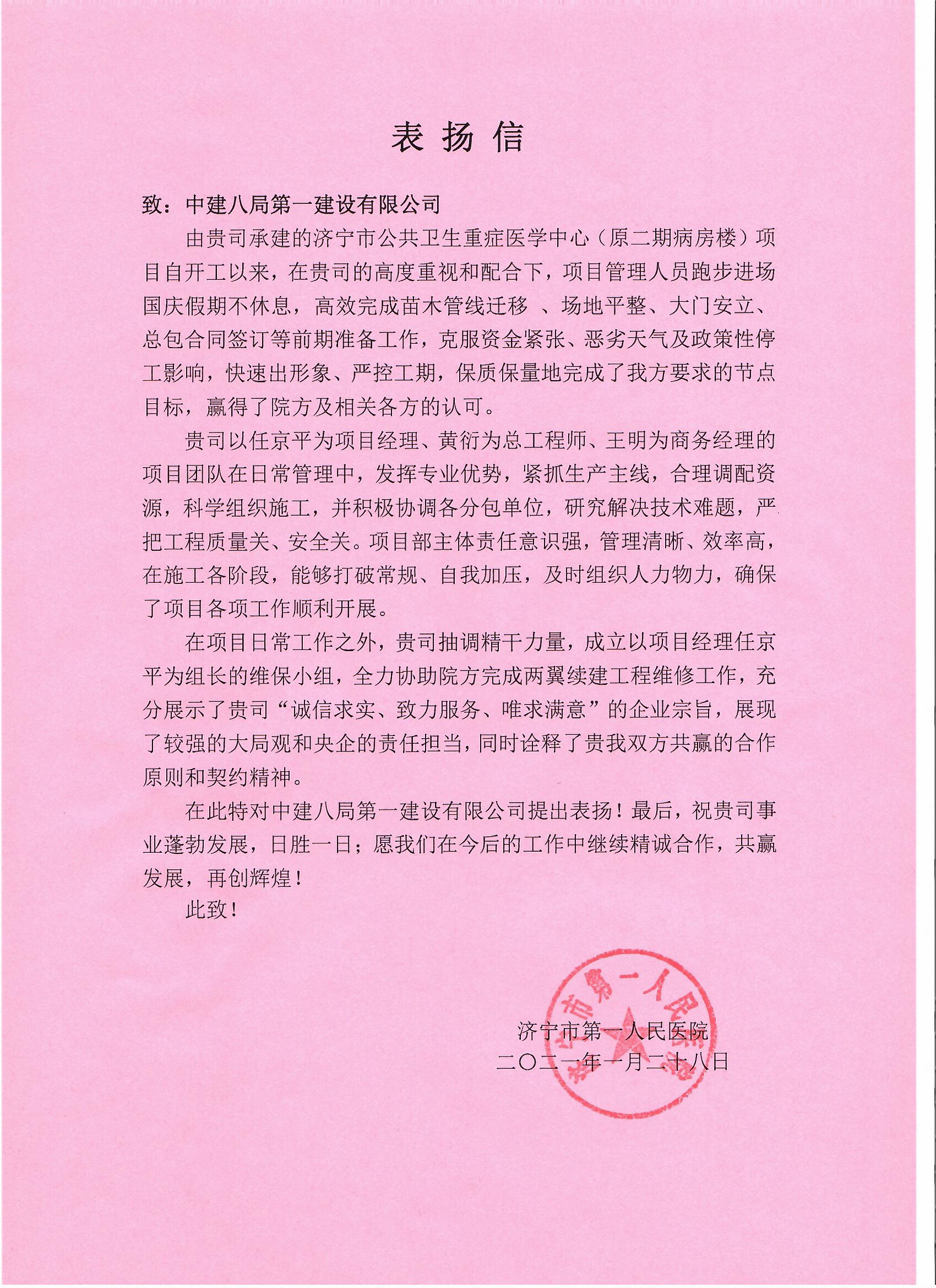 2月1日,濟寧市公共衛(wèi)生重癥醫(yī)學中心項目部收到來自業(yè)主濟寧市第一人民醫(yī)院的一封表揚信。