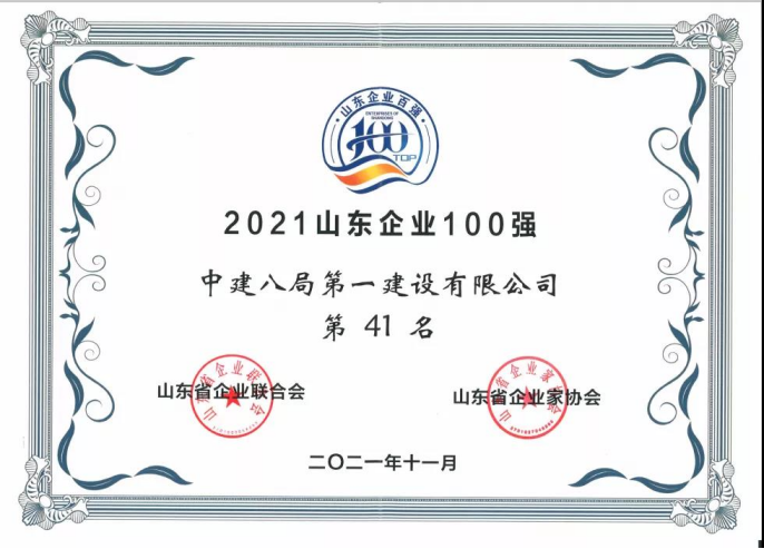 繼榮獲國資委“標桿企業”、全國質量獎組織獎等一系列重磅榮譽后,中建八一再度榮獲“2021年度山東省百強企業”,位列第41名。至此,公司已連續2年躋身山東省百強企業前50名!