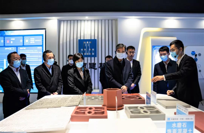 會談前,曾贊榮、單廣袖一行在中國建筑綠色產業園(濟南)調研了建筑產業化工廠、新型模架智造基地和幕墻產業基地,聽取產業園區生產建設情況匯報,觀摩四代pc構件生產線、自動鋼筋加工生產線運行情況,察看項目自主研發的智慧工廠管理平臺,了解透光混凝土掛板、保溫一體化掛板等產品情況和項目年產能、生產規模等運營情況。