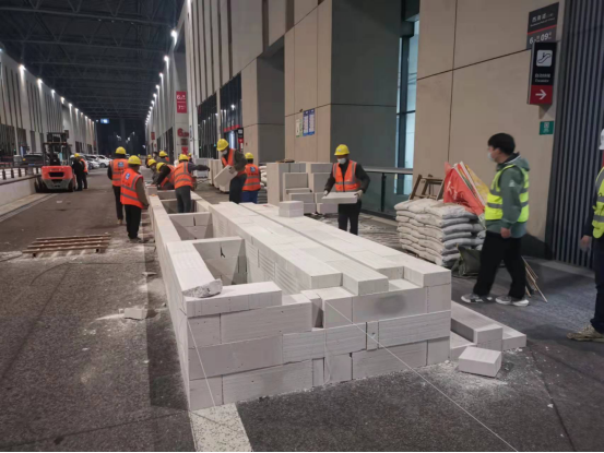 截至下午17點,現場累計進場的管理人員達100余人,工人達200余人。與此同時,機械設備、以及各類建設物資正陸續進場,目前已進場加氣混凝土砌塊近500m3,集裝箱樣板房140個,熱水器150臺、成品水池290個、成品蹲坑390個、淋浴房150個,石灰砂漿、粘結劑等60余噸。預計4月6日上午9點前將完成所屬區域140個集裝箱的吊裝工作,并確保在4月6日內完成集裝箱墻板改造以及成品衛浴的安裝,實現所有箱體衛生設施就位。