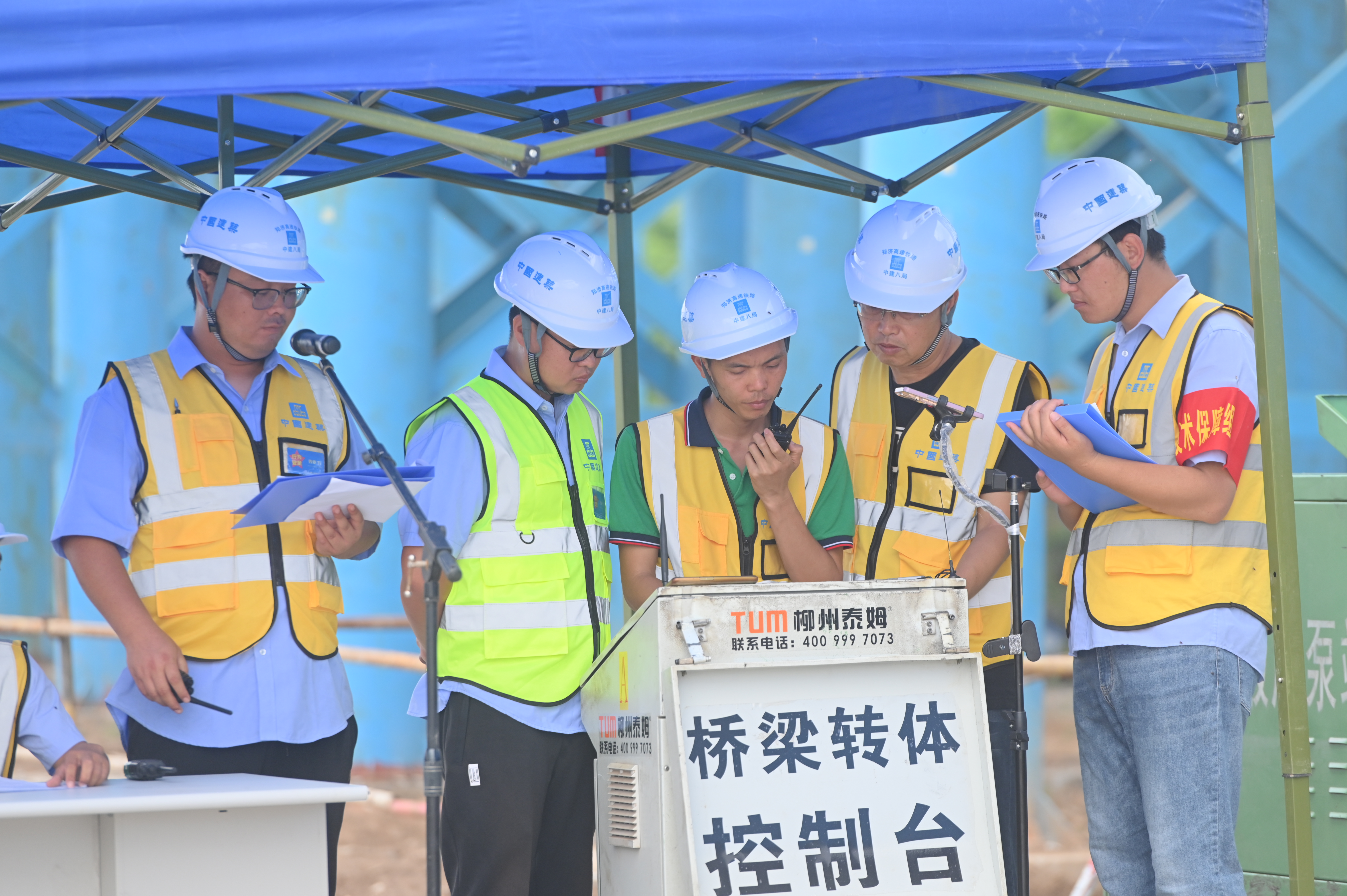 “巨無霸”轉體的背后,全是精細活兒。轉體施工以球鉸為支撐,通過主控臺操控智能連續千斤頂使梁體轉動,撐腳滑道人員實時觀測轉體系統受力狀態,根據轉盤上的刻度、編號,實時監控計算轉動數據,監測風力風速,確保轉體施工進度可控、外觀精度準確、安全系數達標。