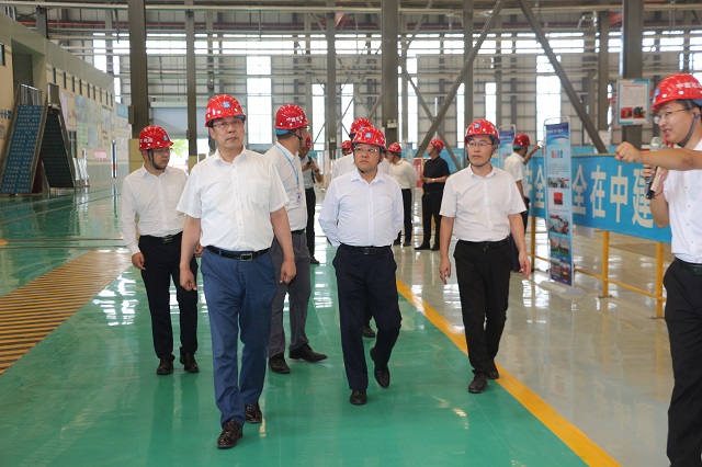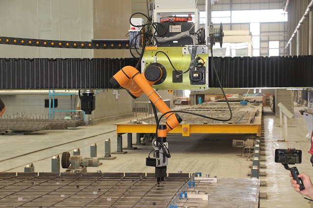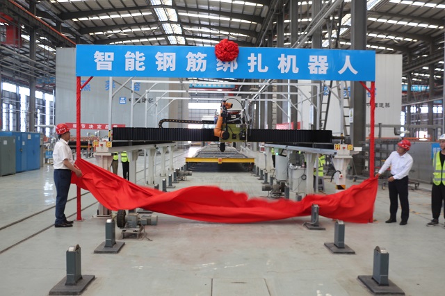 隨后,來到第六跨疊合板自動化流水生產線,寧文忠、李鐵軍共同為智能鋼筋綁扎機器人揭彩。該機器人是一種可視覺導引的六軸鋼筋綁扎機器人,安放在流水線的鋼筋綁扎區域,能夠高效精準的進行鋼筋綁扎工作,具有自動識別,精準高效、協同作業、一機雙控等特點,綁扎速度是人工的2倍,大大提高鋼筋綁扎效率。