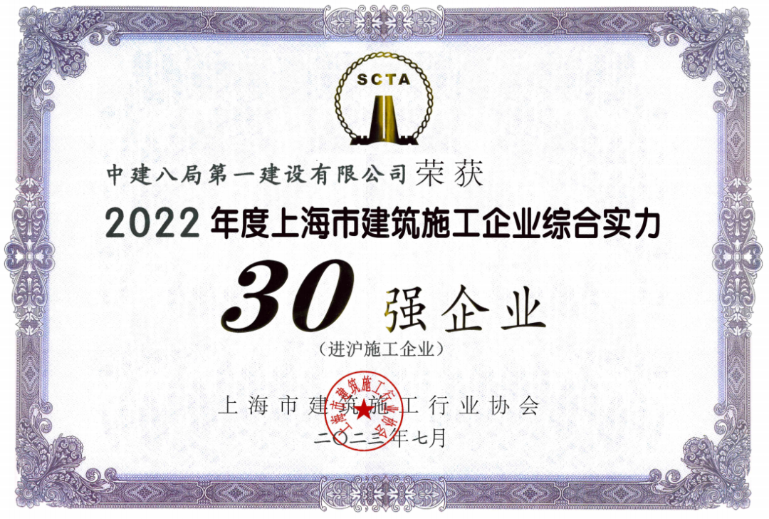 上海市建筑施工企業綜合實力排名由上海市建筑施工行業協會審定公布,是上海市建筑行業最具公信力和社會影響力的權威榜單,以申報企業在滬地區的建安產值、完稅總和、企業管理數據為主要評選標準。中建八局一公司2022年度排名第20,較2021年前進5名。