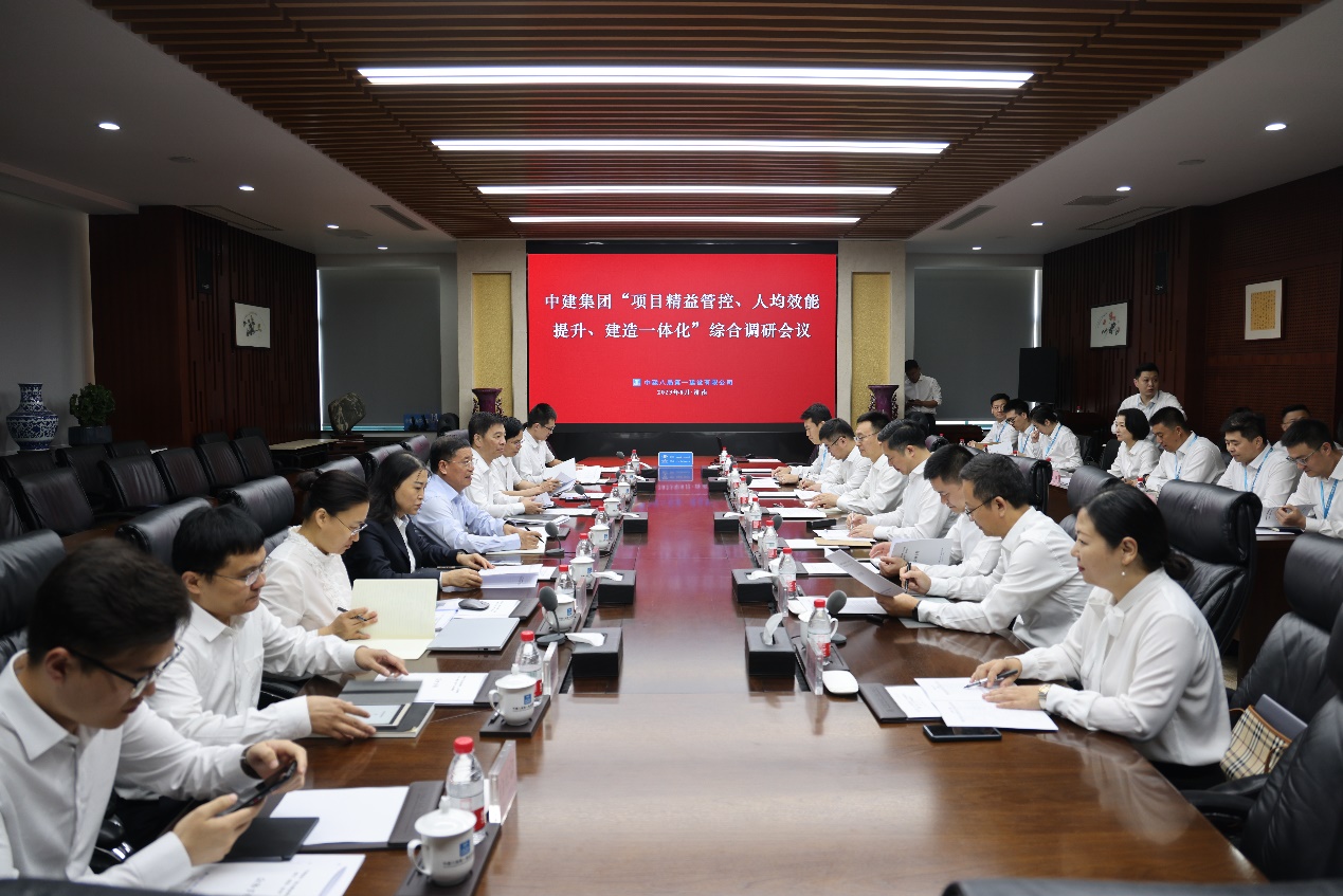 李建偉主持會議,介紹了本次調研的背景、目的和相關工作要求。方思忠代表中建八局向調研組的到來表示歡迎,從紅色基因、對標學習、執行力文化、高目標牽引等方面,介紹了中建八局一公司發展歷程及高質量發展優勢。齊朋從企業基本情況、精益管控、人均效能、建造一體化、黨的建設等情況作綜合匯報。