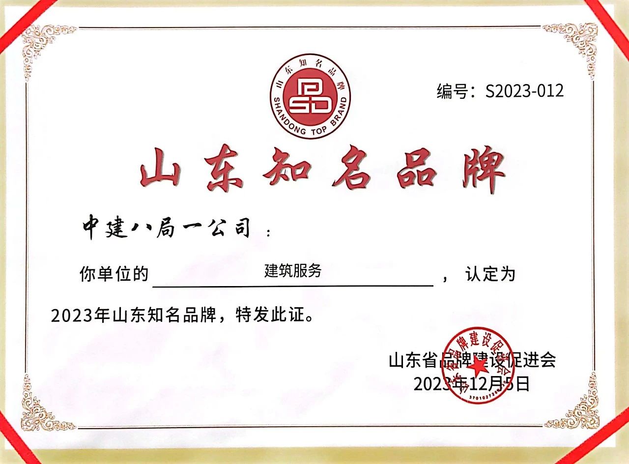中建八局一公司獲2023年山東知名品牌認定