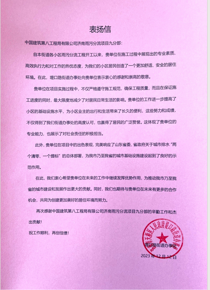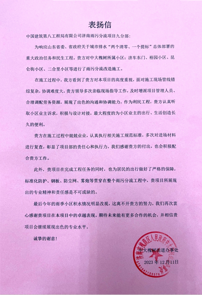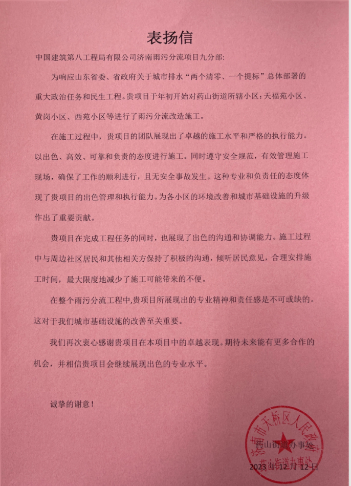 濟南雨污分流項目不僅是居民家門口的“關(guān)鍵小事”,也是環(huán)境改善的“民生大事”,截至目前,項目部已相繼收到錦旗四十余面及多封感謝信、表揚信。