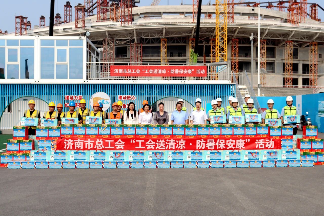7月11日,濟南市總工會“工會送清涼 防暑保安康”活動走進中建八局一公司承建的黃河體育中心專業足球場項目。濟南市總工會黨組成員、副主席宮俊卿,生產保護部部長盧召民,二級調研員王崇山,中建八局一公司黨委副書記、工會主席聶麗,工會工作部、濟南公司相關負責人,項目管理人員及工友代表參加活動。
