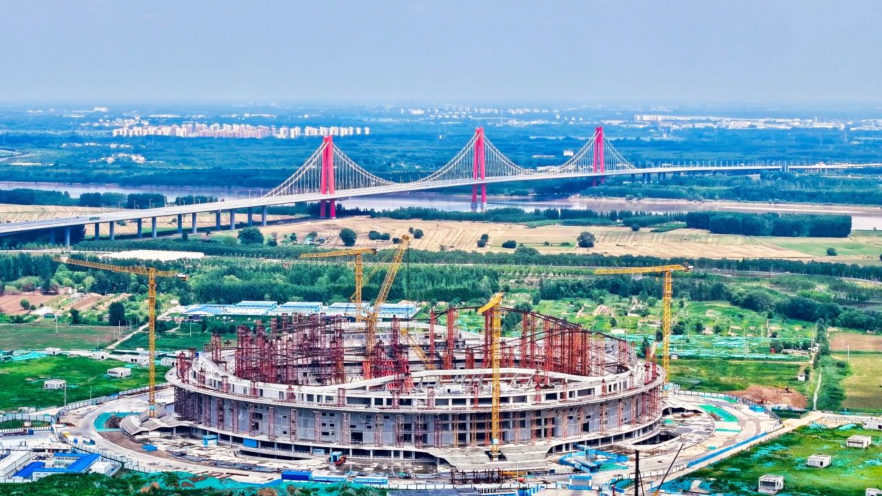 黃河體育中心專業足球場項目位于濟南新舊動能轉換起步區,總建筑面積19.7萬平方米,采用世界杯FIFA最新標準,是山東省首個6萬座專業足球場,黃河流域生態保護與高質量發展戰略重大工程。目前,項目處于屋蓋鋼結構施工階段,預計在2024年底完成合龍。
