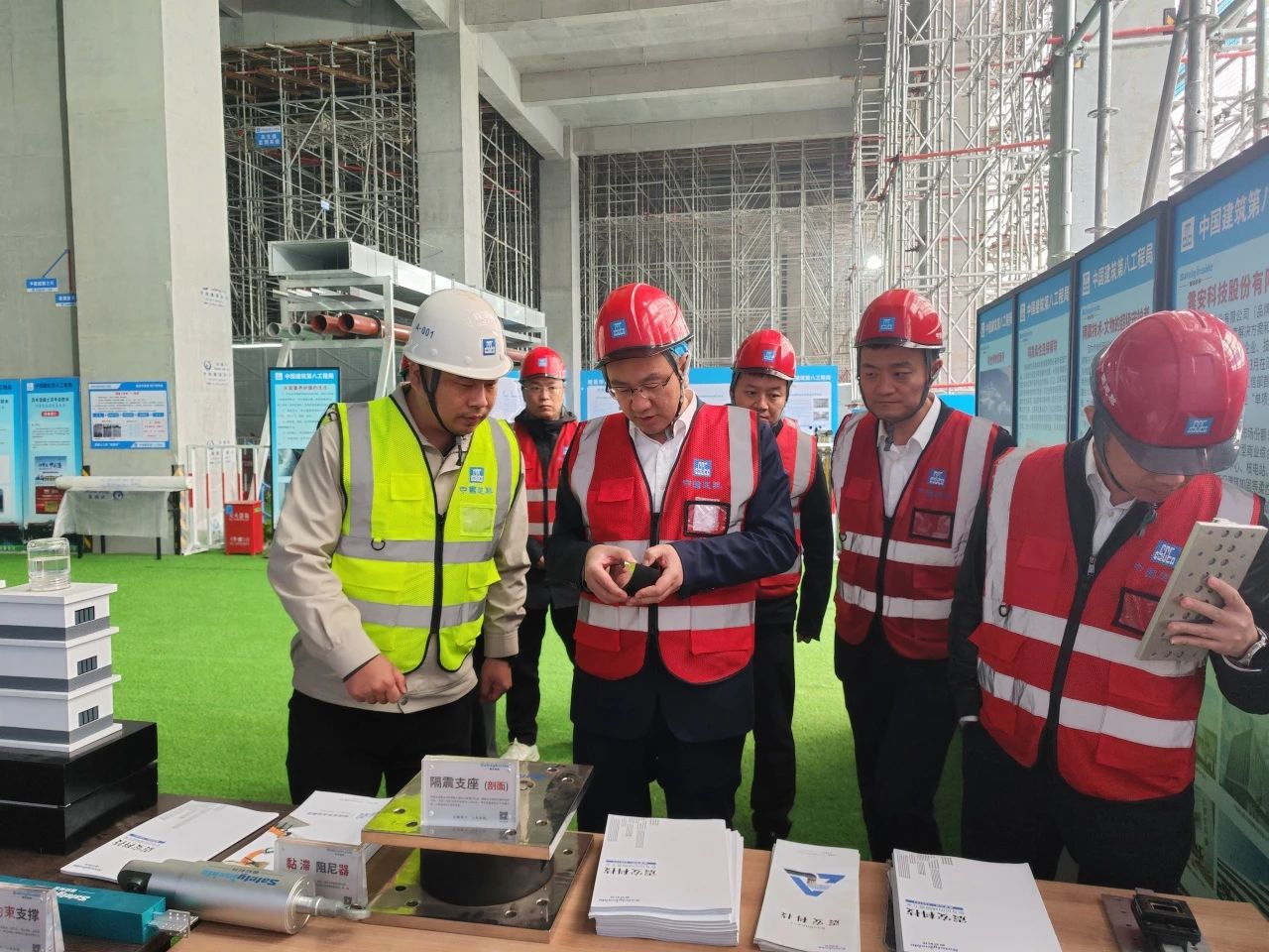 亓立剛深入施工現場,實地查看項目展廳、樣板展示區及施工作業面,詳細了解架體搭設情況、混凝土結構成型質量、隔震工程及高性能混凝土幕墻等施工新技術的應用落地情況。