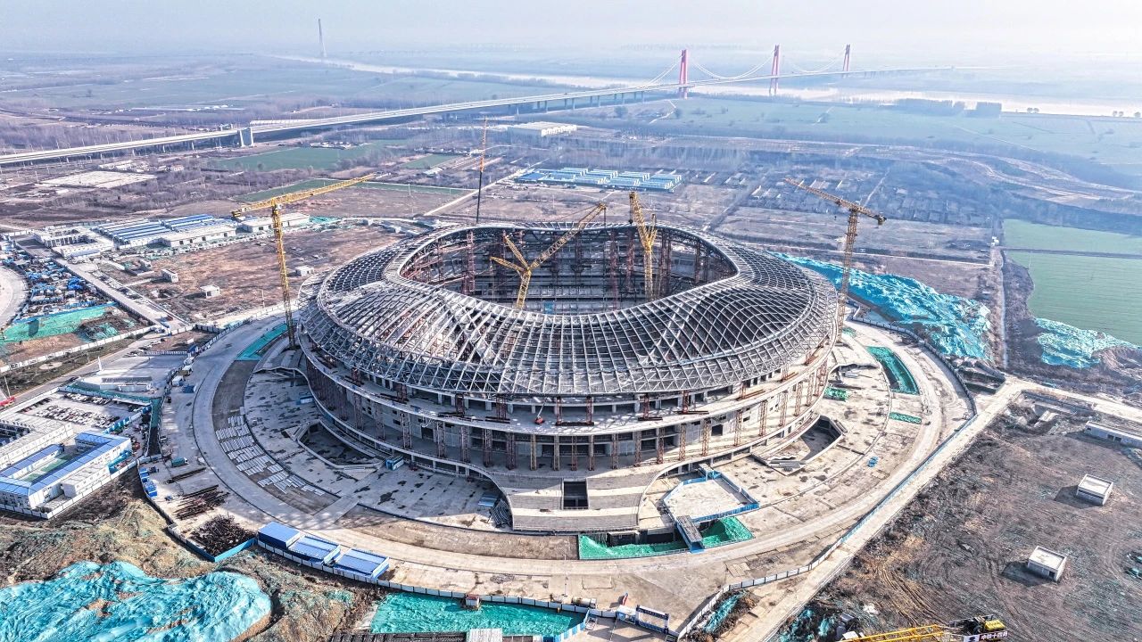 項目采用國際足聯FIFA最新標準,將多種高新科技融入建造當中,是世界首個平面單層膜輪輻式索膜結構體系、國內首例專業足球場大規模應用高透光率PTFE網格膜材料,建成后將以足球為起點、黃河為紐帶,進一步提升體育相關產業能級,助力濟南由“泉城時代”邁進“黃河時代”。目前,項目已完成鋼桁架主體結構合龍,下一步將進行裝飾裝修施工。