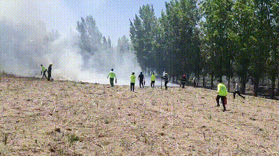 項目救火隊到達火場時,當地消防隊也已經抵達,此時的火情現場濃煙蔽空,刺鼻的焦糊味裹挾著熱浪撲面而來,柳絮燃燒形成的火焰借著風勢,沿著干枯植被與低矮灌木叢擴張,極有可能蔓延至兩邊的村莊與農田。