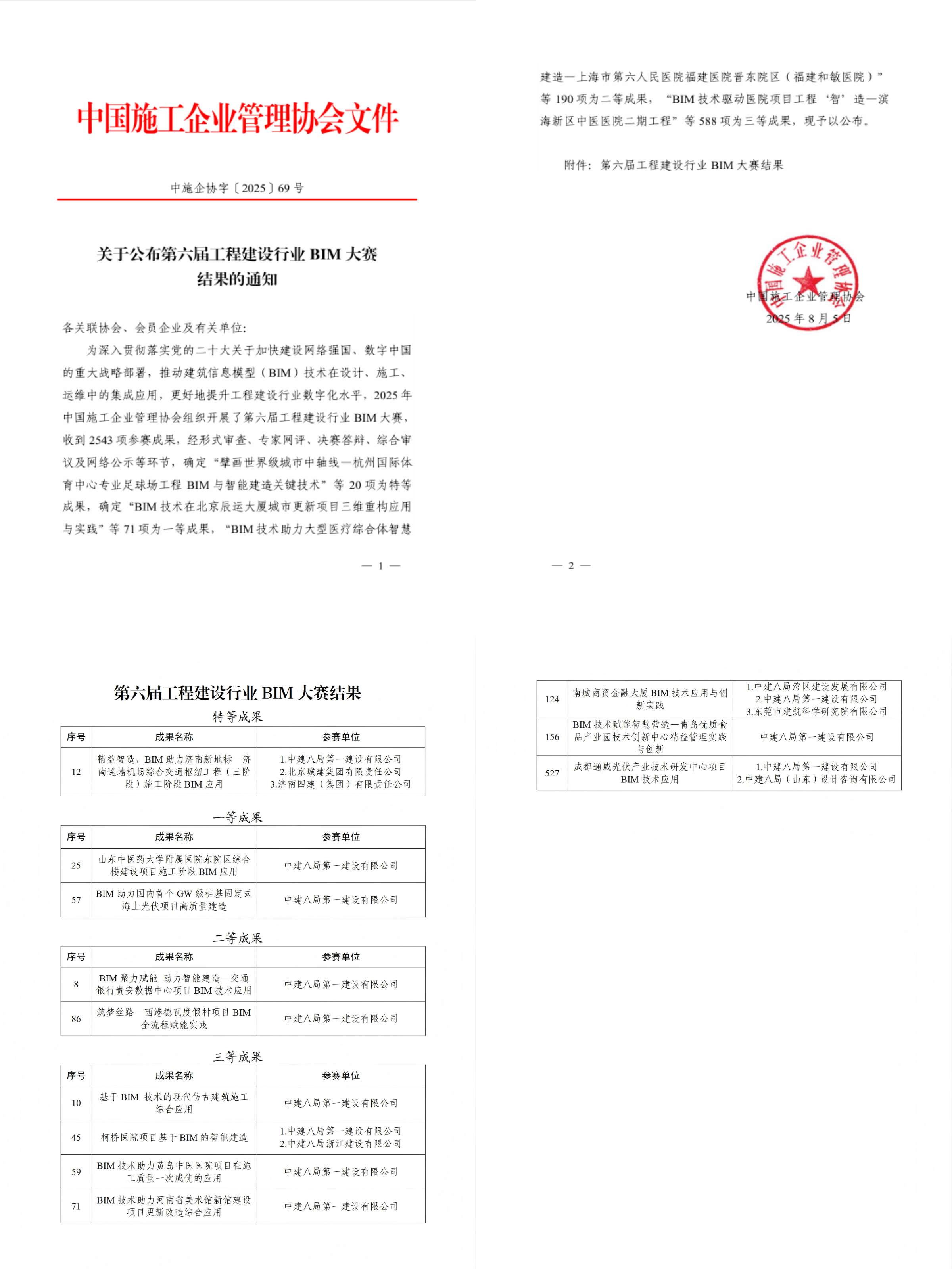 近日,中國施工企業(yè)管理協(xié)會正式公布第六屆工程建設(shè)行業(yè)BIM大賽成果,中建八一榮獲特等成果1項(xiàng)、一等成果2項(xiàng)、二等成果2項(xiàng)、三等成果7項(xiàng),獲獎項(xiàng)目涵蓋機(jī)場建設(shè)、醫(yī)療衛(wèi)生、海上光伏、仿古建筑、工業(yè)園區(qū)等多個領(lǐng)域,充分展現(xiàn)公司智能建造與數(shù)字轉(zhuǎn)型領(lǐng)域特色優(yōu)勢。