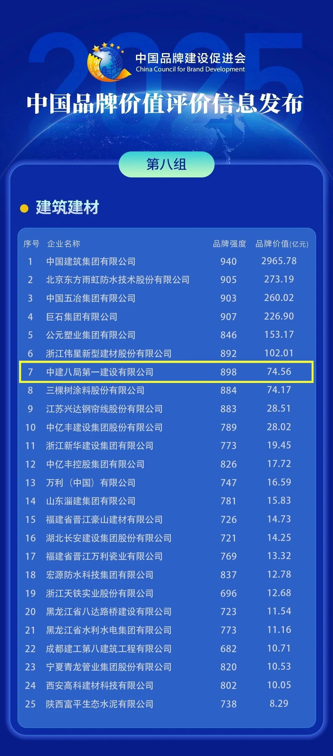 5月10日,由中國品牌建設(shè)促進會、中國資產(chǎn)評估協(xié)會主辦,新華社品牌工作辦公室、《中國品牌》雜志社等單位承辦的“2025中國品牌價值評價信息”在浙江德清正式發(fā)布。 中建八局一公司以品牌強度898、品牌價值74.