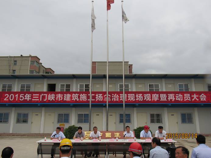 在項目會議室,楊青黑局長作了發言,三門峽萬達廣場投資有限公司總經理葉斌、項目負責人孫金輝、建研凱勃項目總監金成春先后介紹了現場揚塵管理措施;董清華副局長、石順剛副局長,重點宣講了揚塵治理百日行動專項方案。