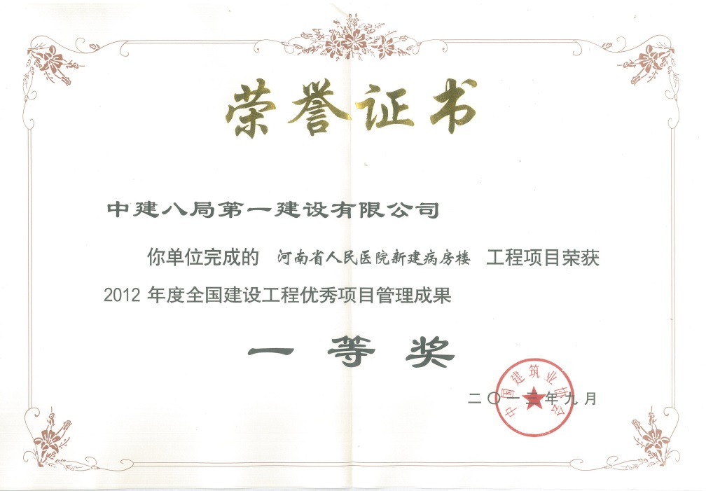 河南省人民醫(yī)院新建病房樓項目榮獲“全國建設(shè)工程優(yōu)秀項目管理成果”一等獎