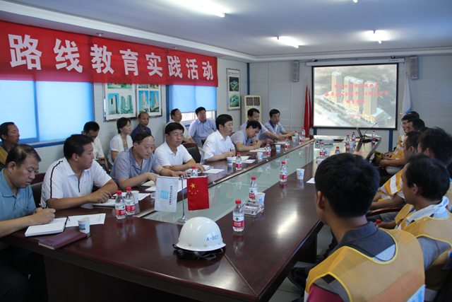 8月9號下午,濟南市紀委書記慕建民、市建委書記張洪躍一行來到奧體金融中心A棟樓項目開展黨的群眾路線教育實踐活動,魯班公司副總經理阮云豐、總工程師史振春、局總經理助理、山東分局黨委書記王克復、公司黨委書記許紅、紀委書記薛樹海、中建一局山東公司總經理張炳成及農民工兄弟代表參加。
