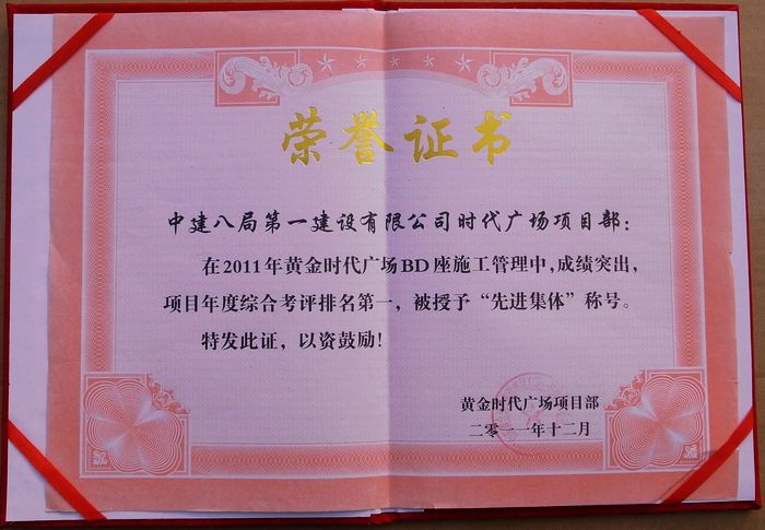 據(jù)悉,黃金時(shí)代廣場(chǎng)項(xiàng)目經(jīng)理部積極響應(yīng)局號(hào)召,深入落實(shí)準(zhǔn)軍事化管理相關(guān)精神,以精細(xì)管理為主線(xiàn),加強(qiáng)技術(shù)質(zhì)量管理,加大開(kāi)源節(jié)流力度,在質(zhì)量、工期、安全等各個(gè)方面取得了較好的成績(jī)。先后榮獲局“準(zhǔn)軍事化管理示范項(xiàng)目”、“山東省安全文明示范工地”、“國(guó)家AAA級(jí)安全文明誠(chéng)信工地”及“總公司2010年度CI創(chuàng)優(yōu)金獎(jiǎng)”等榮譽(yù)稱(chēng)號(hào)。