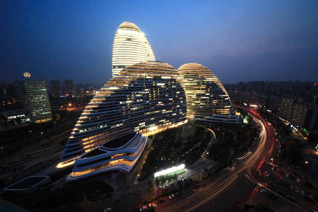望京SOHO位于北京市朝陽區望京街與阜安西路交叉路口,由世界著名建筑師扎哈 ? 哈迪德設計,是從首都機場進入市區的第一個引人注目的高層地標建筑,被稱為“首都第一印象建筑”。與此同時,望京SOHO也與水立方、鳥巢等一起成為了北京的新地標。望京SOHO采取了動態設計理念,仰視時猶如三座相互掩映的山峰,俯視時宛似游動嬉戲的錦鯉。其獨特的曲面造型使建筑物在任何角度都呈現出動態、優雅的美感。塔樓外部被閃爍的鋁板和玻璃覆蓋,與藍天融為一體。此外,望京SOHO屬于綠色環保建筑,推行綠色建筑理念,取得了美國LEED綠色認證標準。