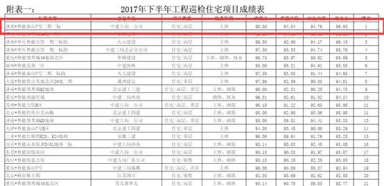近日,公司濟南魯能泰山7號項目在魯能集團2017年下半年全國工程巡檢中,從42個受檢項目中脫穎而出,實測實量成績獲得98.5分,質量風險獲得94.84分,安全文明風險獲得94.76分,綜合成績為96.65分,勇奪第一名。