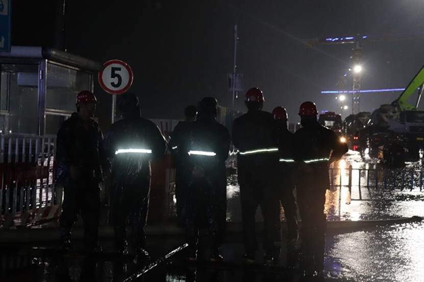 積水排空后20分鐘內,華北公司副總經理劉達帶領項目部管理人員立即組織夜班施工人員全部回到崗位,及時綁扎N95152526282933倉負二層頂板鋼筋,E3510倉豎墻鋼筋、9倉頂板鋼筋和1314倉底板防水施工。
