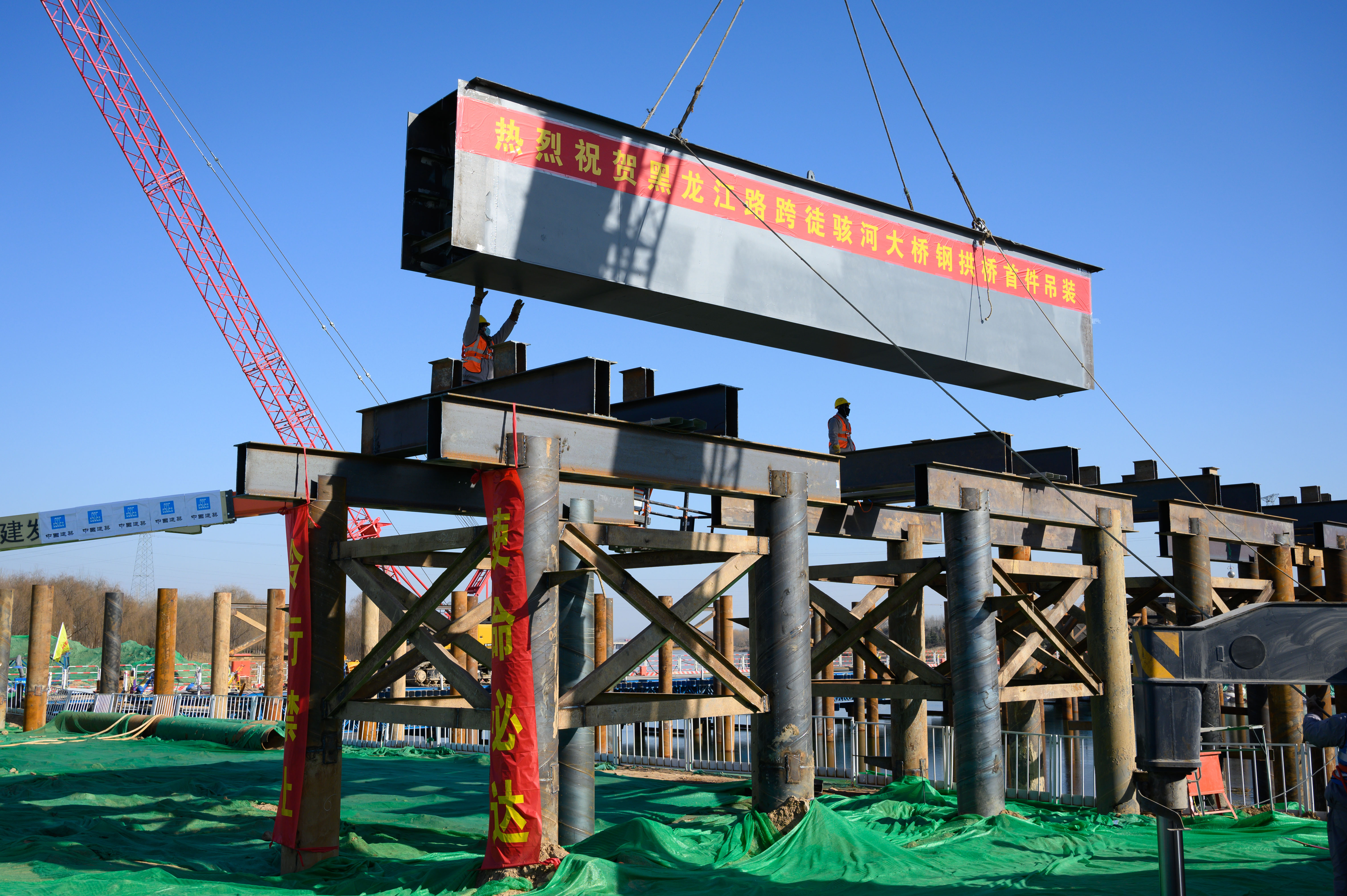 1月7日,在山東聊城,山東省內采用UHPC混凝土的最大鋼結構中承式桁架拱橋——聊城市黑龍江路跨徒駭河大橋,在-19℃嚴寒中進行了第一次鋼結構主縱梁桿件吊裝,標志著大橋正式從下部結構施工進行到上部鋼結構施工。